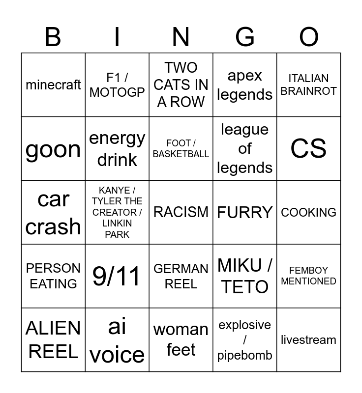 This bingo card has a free space and 24 words: 9/11, ai voice, FOOT / BASKETBALL, ALIEN REEL, ITALIAN BRAINROT, minecraft, goon, F1 / MOTOGP, FURRY, GERMAN REEL, league of legends, car crash, MIKU / TETO, FEMBOY MENTIONED, energy drink, explosive / pipebomb, COOKING, TWO CATS IN A ROW, CS, KANYE / TYLER THE CREATOR / LINKIN PARK, livestream, PERSON EATING, apex legends and woman feet.