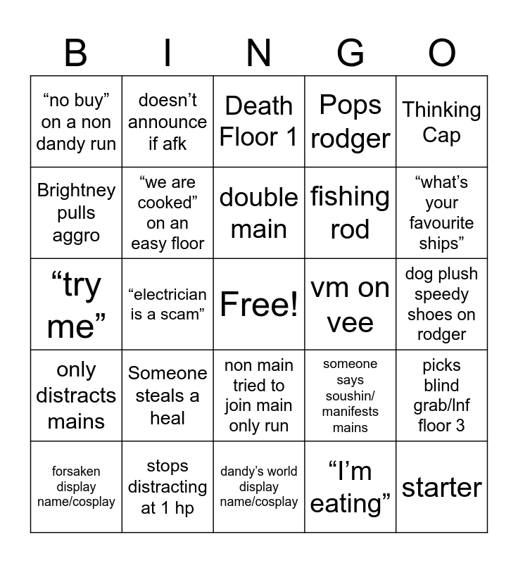 This bingo card has a free space and 78 words: Fancy Purse, “Can I”, Death Floor 1, Wrench, Sprout threatens to grief if tapes taken, Cosmo doesn’t heal, “Who’s distracting”, Runs into kiting loop, Rodger takes aggro, Someone walks out of ele and gets hit during panic, All teammates die before 1 main spawns, “Can I have research”, Pops rodger, “no buy” on a non dandy run, Coin Purse, Brightney pulls aggro, “griefer”, Someone steals a heal, vm + part, dog plush speedy shoes on rodger, fancy purse wrench on cosmo, Thinking Cap, “try me”, double main, “we are cooked” on an easy floor, “dandy is preparing us”, insulting dandy during a bad shop, goob w bad trinkets offering to distract, extractor pebble, “i have vm”, “what’s your favourite ships”, “omg _ floor”, dandy’s world display name/cosplay, crk display name/cosplay, forsaken display name/cosplay, vm on vee, flutter in match, scraps in match, dog plush on 1/2* speed toons, starter, water cooler, 2+ of the same toon in 1 run, “save heals/tapes for me”, griefer, afk below floor 5, doesn’t announce if afk, someone on 1 first floor, picks heal card floor 3, picks heal card when everyone is on 2/ full, picks blind grab/lnf over suppression/tech savvy, picks blind grab/lnf floor 3, “electrician is a scam”, someone says soushin/ manifests mains, egg radar/christmas lights, distractor dies before floor 5, LMS before floor 5, bone, overfill, someone leaves lobby last second, non main tried to join main only run, fishing rod, pink bow, main spawns floor 5, griefing accusation, activates rnd, “i’m gonna touch you” joke, someone dcs/leaves, hides in blackouts, only distracts mains, stops distracting at 1 hp, silent, says gte/ eae, diary on 1-2* stealth toon, most of the lobby (4+) has solid trinkets, “I’m eating”, 3+ vintage skins, arguments in general and takes tapes with a sprout in lobby.