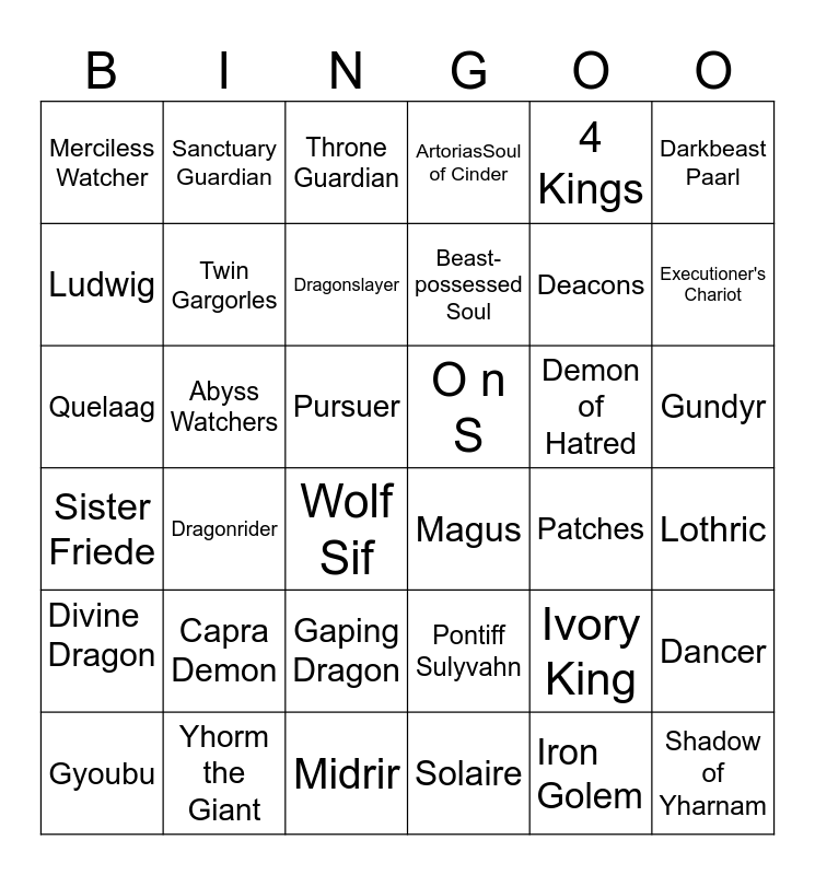 This bingo card has 36 words: Pontiff Sulyvahn, Gaping Dragon, Solaire, Ludwig, Sister Friede, O n S, Twin Gargorles, Midrir, 4 Kings, Ivory King, Executioner's Chariot, ArtoriasSoul of Cinder, Dancer, Abyss Watchers, Beast-possessed Soul, Merciless Watcher, Divine Dragon, Demon of Hatred, Quelaag, Throne Guardian, Pursuer, Dragonrider, Magus, Wolf Sif, Patches, Sanctuary Guardian, Deacons, Yhorm the Giant, Dragonslayer, Darkbeast Paarl, Shadow of Yharnam, Gyoubu, Lothric, Gundyr, Capra Demon and Iron Golem.