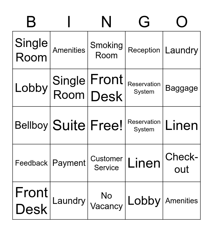 This bingo card has a free space and 65 words: Reception, Reservation, Check-in, Check-out, Housekeeping, Concierge, Amenities, Room Service, Front Desk, Booking, Customer Service, Guest, Linen, Laundry, Maintenance, Lobby, Suite, Single Room, Double Room, Reservation System, Payment, Feedback, Reception, Reservation, Check-in, Check-out, Housekeeping, Concierge, Amenities, Room Service, Front Desk, Booking, Customer Service, Guest, Linen, Laundry, Maintenance, Bellboy, Lobby, Suite, Single Room, Double Room, Reservation System, Payment, Feedback, Adjoining Rooms, Baggage, Booking Confirmation, Cancellation Policy, Complimentary, Deposit, Damage Charge, Late Charge, No Vacancy, Overbooking, Room Availability, Room Rate, Smoking Room, Smoking Policy, Special Request, Standard Room, Twin Room, Valet Parking, Wake-up Call and Wi-Fi Access.
