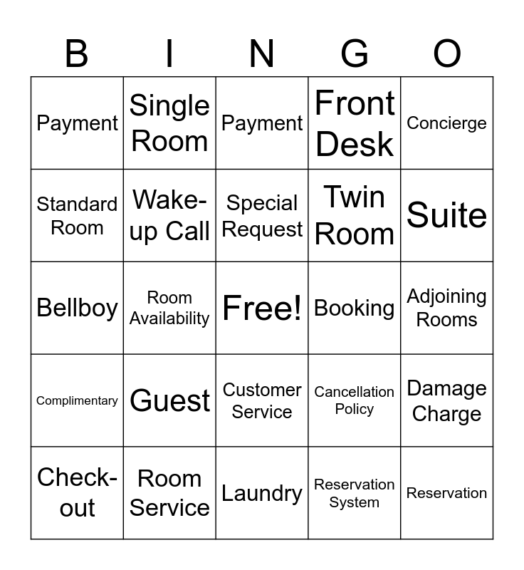 This bingo card has a free space and 45 words: Reception, Reservation, Check-in, Check-out, Housekeeping, Reservation System, Payment, Feedback, Concierge, Room Service, Front Desk, Booking, Customer Service, Guest, Linen, Laundry, Maintenance, Bellboy, Lobby, Suite, Single Room, Double Room, Reservation System, Payment, Feedback, Adjoining Rooms, Baggage, Booking Confirmation, Cancellation Policy, Complimentary, Deposit, Damage Charge, Late Charge, No Vacancy, Overbooking, Room Availability, Room Rate, Smoking Room, Smoking Policy, Special Request, Standard Room, Twin Room, Valet Parking, Wake-up Call and Wi-Fi Access.