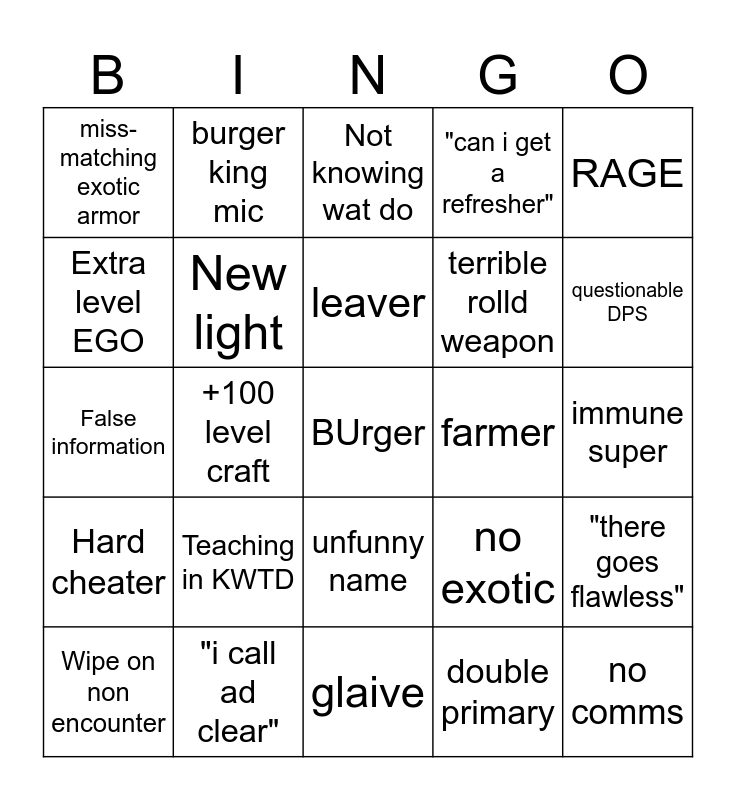 This bingo card has a free space and 24 words: Teaching in KWTD, "i call ad clear", leaver, Wipe on non encounter, RAGE, miss-matching exotic armor, Extra level EGO, burger king mic, farmer, unfunny name, terrible rolld weapon, False information, no exotic, "there goes flawless", New light, double primary, immune super, Not knowing wat do, questionable DPS, +100 level craft, no comms, Hard cheater, "can i get a refresher" and glaive.