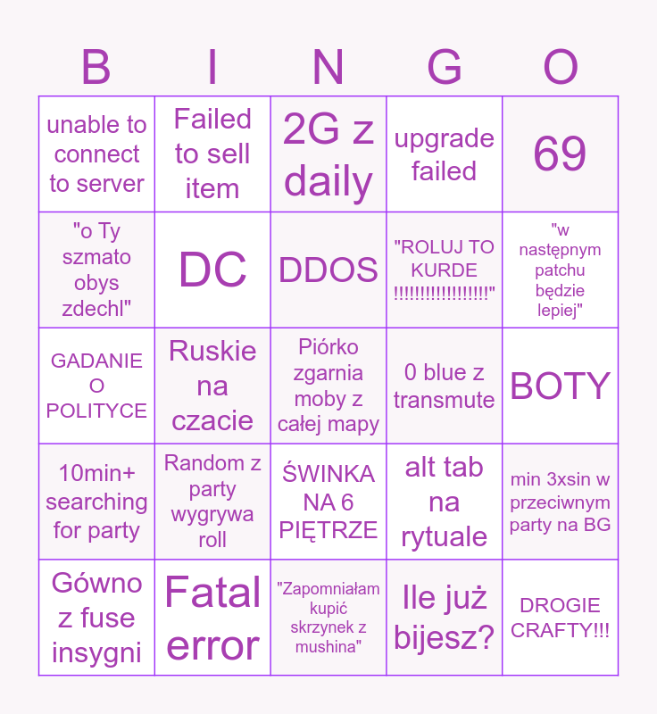 This bingo card has a free space and 24 words: Random z party wygrywa roll, Fatal error, DDOS, Gówno z fuse insygni, 69, unable to connect to server, "o Ty szmato obys zdechl", Failed to sell item, 0 blue z transmute, ŚWINKA NA 6 PIĘTRZE, "ROLUJ TO KURDE !!!!!!!!!!!!!!!!!!", GADANIE O POLITYCE, alt tab na rytuale, min 3xsin w przeciwnym party na BG, DC, Ile już bijesz?, BOTY, 2G z daily, "w następnym patchu będzie lepiej", Ruskie na czacie, DROGIE CRAFTY!!!, 10min+ searching for party, upgrade failed and "Zapomniałam kupić skrzynek z mushina".