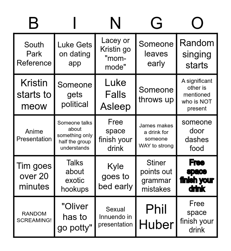 This bingo card has a free space and 28 words: Free space finish your drink, Lacey says "you guysss", Someone throws up, Phil Huber, Kristin starts to meow, Lacey or Kristin go "mom-mode", Luke Gets on dating app, Tim goes over 20 minutes, James makes a drink for someone WAY to strong, RANDOM SCREAMING!, Anime Presentation, Someone leaves early, "Oliver has to go potty", Sexual Innuendo in presentation, A significant other is mentioned who is NOT present, Free space finish your drink, Talks about exotic hookups, Someone gets political, Luke Falls Asleep, Kyle goes to bed early, South Park Reference, Someone has to pee within 1st 3 presentations, Free space finish your drink, Someone talks about something only half the group understands, someone door dashes food, Stiner points out grammar mistakes, Random singing starts and Free space finish your drink.