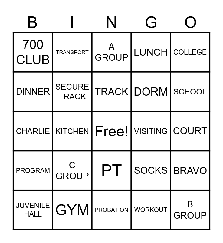 This bingo card has a free space and 29 words: MONTEREY COUNTY, GYM, A GROUP, YOUTH CENTER, COLLEGE, 700 CLUB, SECURE TRACK, TRACK, VISITING, BRAVO, JUVENILE HALL, KITCHEN, WORKOUT, B GROUP, CHARLIE, SAFETY CHECKS, PROBATION, SOCKS, SCHOOL, PROGRAM, C GROUP, GARDEN, DORM, COURT, DINNER, TRANSPORT, PT, LUNCH and BREAKFAST.