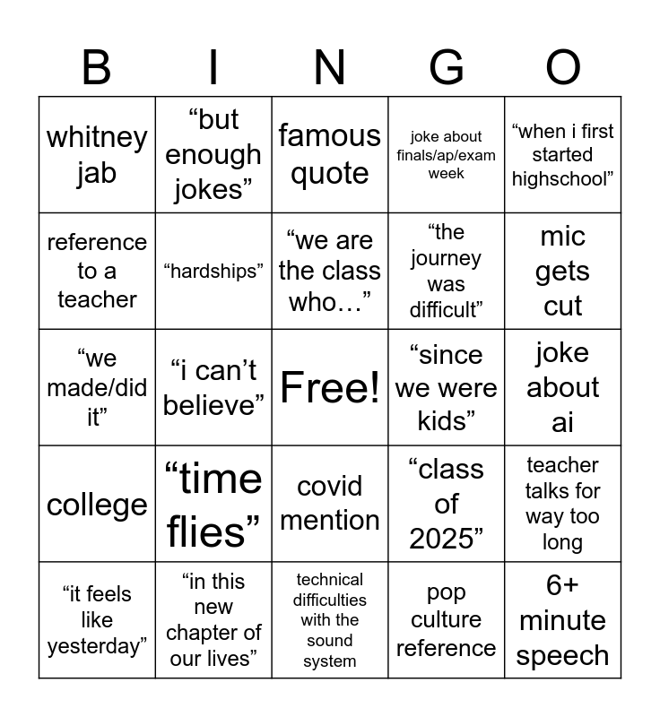 This bingo card has a free space and 26 words: covid mention, pop culture reference, “we are the class who…”, “in this new chapter of our lives”, “when i first started highschool”, whitney jab, reference to a teacher, “but enough jokes”, joke about ai, “class of 2025”, “the journey was difficult”, “we made/did it”, teacher talks for way too long, “it feels like yesterday”, “i can’t believe”, joke about a school incident, joke about finals/ap/exam week, college, famous quote, 6+ minute speech, mic gets cut, technical difficulties with the sound system, “since we were kids”, “time flies”, “hardships” and subtle brag.
