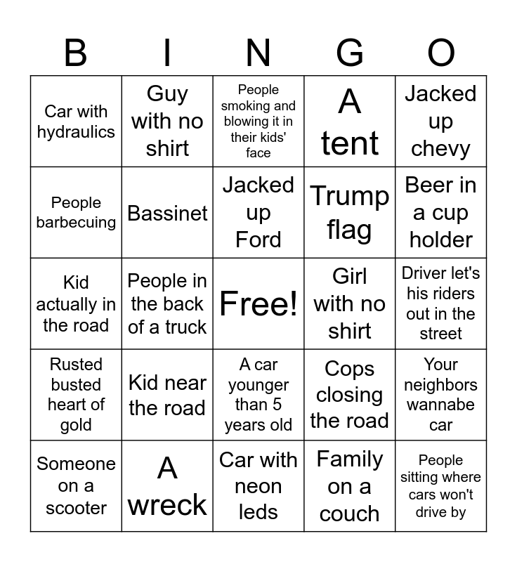This bingo card has a free space and 24 words: Kid near the road, A wreck, Jacked up Ford, Someone on a scooter, Jacked up chevy, Car with hydraulics, People barbecuing, Guy with no shirt, Girl with no shirt, A car younger than 5 years old, Trump flag, Kid actually in the road, Cops closing the road, Your neighbors wannabe car, Bassinet, Family on a couch, Driver let's his riders out in the street, People smoking and blowing it in their kids' face, Beer in a cup holder, People in the back of a truck, People sitting where cars won't drive by, Rusted busted heart of gold, A tent and Car with neon leds.