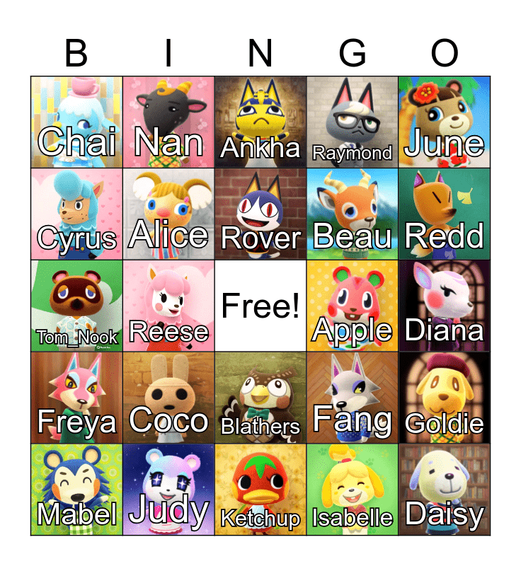 This bingo card has 34 images, a free space and 35 words: Blanche, Bill, Bam, Raymond, Goldie, Tom_Nook, Alice, Camofrog, Beau, Apollo, Freya, Nan, Sprocket, Marina, Chai, Coco, Ketchup, Apple, Diana, Mabel, Judy, Ankha, Isabelle, Daisy, Cyrus, Reese, Blathers, Label, Redd, KK.Slider, Resetti, Rover, Fang, June and W.