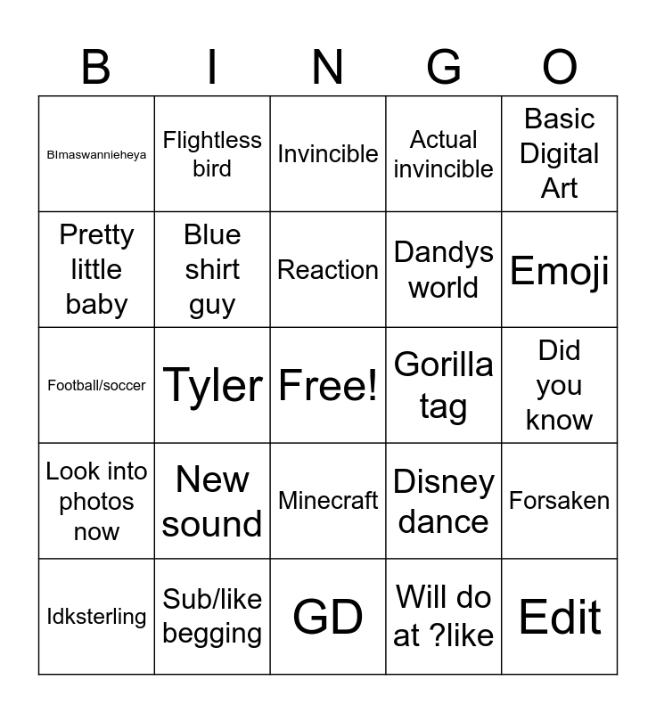 This bingo card has a free space and 24 words: Idksterling, New sound, Reaction, Will do at ?like, Basic Digital Art, BImaswannieheya, Flightless bird, Invincible, Gorilla tag, Did you know, Football/soccer, Blue shirt guy, Disney dance, Forsaken, Pretty little baby, Sub/like begging, GD, Actual invincible, Emoji, Look into photos now, Tyler, Minecraft, Dandys world and Edit.