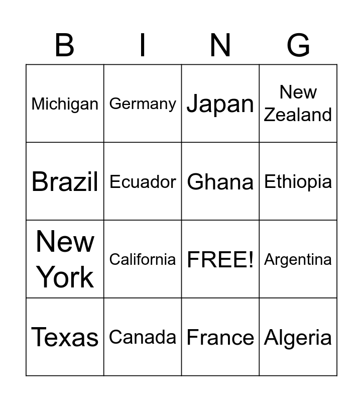 This bingo card has 16 words: Canada, Argentina, Japan, Michigan, New York, Germany, FREE!, France, Brazil, Ecuador, Texas, New Zealand, California, Ethiopia, Ghana and Algeria.
