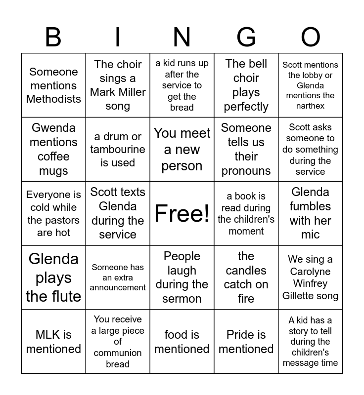 This bingo card has a free space and 24 words: Someone has an extra announcement, You receive a large piece of communion bread, You meet a new person, MLK is mentioned, Scott mentions the lobby or Glenda mentions the narthex, Someone mentions Methodists, Gwenda mentions coffee mugs, The choir sings a Mark Miller song, a book is read during the children's moment, People laugh during the sermon, Someone tells us their pronouns, Everyone is cold while the pastors are hot, the candles catch on fire, We sing a Carolyne Winfrey Gillette song, a drum or tambourine is used, Pride is mentioned, Glenda fumbles with her mic, a kid runs up after the service to get the bread, Scott asks someone to do something during the service, Scott texts Glenda during the service, A kid has a story to tell during the children's message time, Glenda plays the flute, The bell choir plays perfectly and food is mentioned.