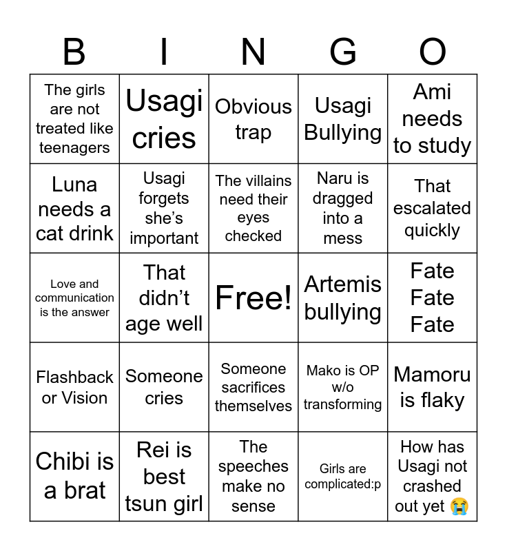 This bingo card has a free space and 24 words: Someone cries, Rei is best tsun girl, The villains need their eyes checked, Chibi is a brat, Ami needs to study, The girls are not treated like teenagers, Luna needs a cat drink, Usagi cries, Artemis bullying, Someone sacrifices themselves, Naru is dragged into a mess, Love and communication is the answer, Mako is OP w/o transforming, Mamoru is flaky, Usagi forgets she’s important, Girls are complicated:p, Fate Fate Fate, Obvious trap, That escalated quickly, That didn’t age well, How has Usagi not crashed out yet 😭, Flashback or Vision, Usagi Bullying and The speeches make no sense.