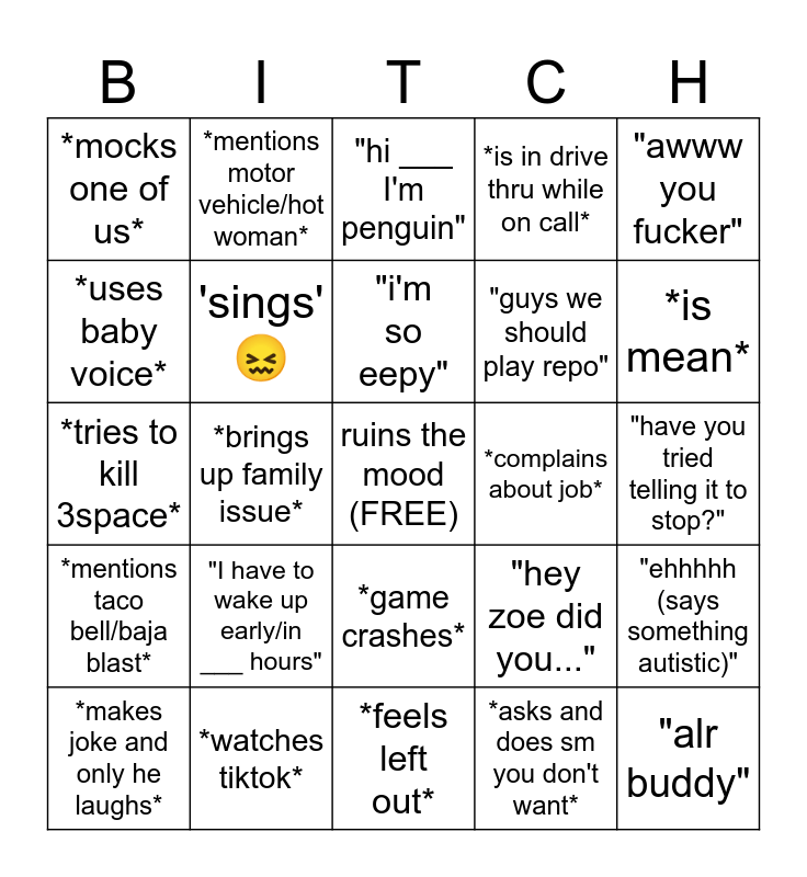 This bingo card has a free space and 24 words: "I have to wake up early/in ___ hours", *watches tiktok*, "i'm so eepy", *makes joke and only he laughs*, "awww you fucker", *mocks one of us*, *uses baby voice*, *mentions motor vehicle/hot woman*, *complains about job*, *game crashes*, "guys we should play repo", *tries to kill 3space*, "hey zoe did you...", "ehhhhh (says something autistic)", 'sings' 😖, *asks and does sm you don't want*, "have you tried telling it to stop?", "hi ___ I'm penguin", *is mean*, *brings up family issue*, "alr buddy", *mentions taco bell/baja blast*, *is in drive thru while on call* and *feels left out*.