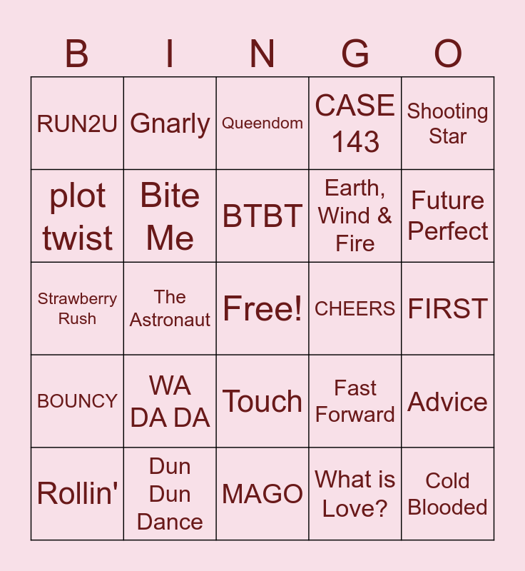 This bingo card has a free space and 36 words: Ditto, after like, S-Class, Bite Me, Fast Forward, BOUNCY, BTBT, Rover, Shooting Star, Ay-yo, The Astronaut, CASE 143, Shut Down, CHEERS, Future Perfect, RUN2U, INVU, WA DA DA, Cold Blooded, Queendom, FIRST, Advice, Dun Dun Dance, Rollin', MAGO, Gnarly, Strawberry Rush, PTT, Earth, Wind & Fire, plot twist, DUH!, Girls Never Die, What is Love?, Touch, Like Jennie and APT..