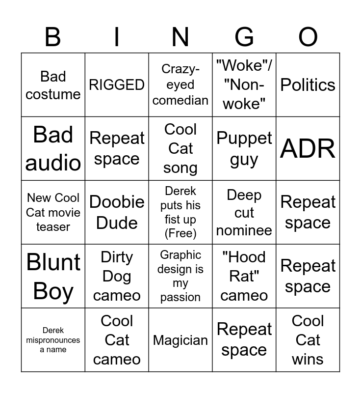 This bingo card has a free space and 24 words: Dirty Dog cameo, Cool Cat cameo, Cool Cat song, Derek mispronounces a name, Politics, Bad costume, Bad audio, RIGGED, Deep cut nominee, Graphic design is my passion, Puppet guy, New Cool Cat movie teaser, "Hood Rat" cameo, Repeat space, Repeat space, Repeat space, Repeat space, Crazy-eyed comedian, ADR, Doobie Dude, Cool Cat wins, Blunt Boy, "Woke"/ "Non-woke" and Magician.