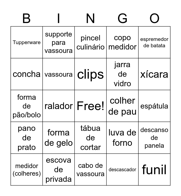 This bingo card has a free space and 37 words: pyrex, faca, cortador de pizza, vassoura, descanso de panela, forma de gelo, clips, travessa, espremedor de batata, tesoura, ralador, copo medidor, funil, espátula, concha, pano de prato, batedor de ovos, pincel culinário, tábua de cortar, colher de pau, Tupperware, xícara, medidor (colheres), cabo de vassoura, organizador de gaveita, descascador, supporte para vassoura, pinça, corkscrew, saleiro, pimenta, escova de privada, forma de pão/bolo, tapete, luva de forno, jarra de vidro and copo.