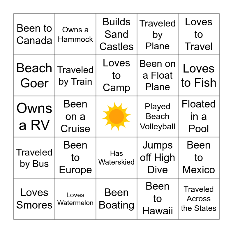 This bingo card has a free space and 24 words: Been to Europe, Loves Watermelon, Loves to Camp, Loves Smores, Loves to Travel, Been to Canada, Beach Goer, Owns a Hammock, Played Beach Volleyball, Has Waterskied, Been on a Float Plane, Owns a RV, Jumps off High Dive, Been to Mexico, Traveled by Train, Been to Hawaii, Floated in a Pool, Builds Sand Castles, Loves to Fish, Been on a Cruise, Traveled Across the States, Traveled by Bus, Traveled by Plane and Been Boating.