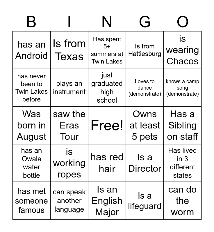 This bingo card has a free space and 24 words: is working ropes, can speak another language, just graduated high school, has met someone famous, is wearing Chacos, has an Android, has never been to Twin Lakes before, Is from Texas, Owns at least 5 pets, has red hair, Loves to dance (demonstrate), Was born in August, Is a Director, Has lived in 3 different states, plays an instrument, Is a lifeguard, Has a Sibling on staff, Has spent 5+ summers at Twin Lakes, knows a camp song (demonstrate), saw the Eras Tour, can do the worm, has an Owala water bottle, Is from Hattiesburg and Is an English Major.