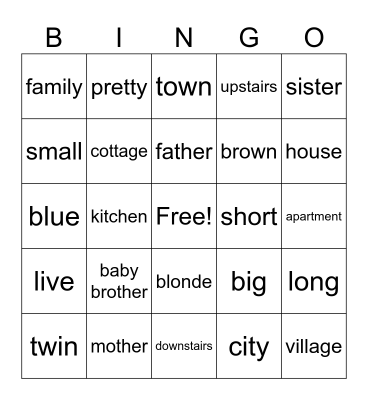 This bingo card has a free space and 24 words: baby brother, mother, father, twin, sister, family, small, pretty, short, blonde, brown, blue, big, long, cottage, city, apartment, town, house, kitchen, village, live, upstairs and downstairs.