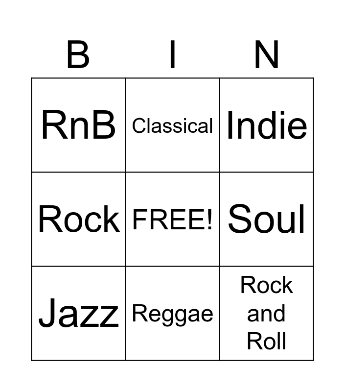 This bingo card has a free space and 14 words: Pop, Hip Hop, Jazz, Classical, Rock, Rock and Roll, Country, Disco, Reggae, RnB, Funk, Soul, Indie and Big Band and Swing.