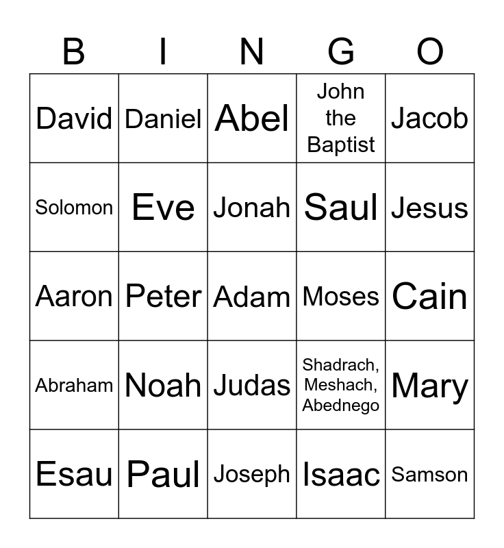 This bingo card has 25 words: Noah, Joseph, Jonah, Esau, Jacob, David, Solomon, Daniel, Moses, Judas, Saul, Aaron, Shadrach, Meshach, Abednego, Mary, Eve, Samson, Cain, Abel, Jesus, Peter, Adam, Paul, Abraham, John the Baptist and Isaac.