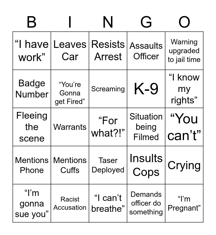 This bingo card has 25 words: Mentions Phone, Racist Accusation, “For what?!”, Demands officer do something, Warning upgraded to jail time, “I have work”, Leaves Car, Resists Arrest, Situation being Filmed, Crying, Badge Number, “You’re Gonna get Fired”, “I can’t breathe”, Insults Cops, “I know my rights”, “I’m gonna sue you”, Warrants, Screaming, K-9, “You can’t”, Fleeing the scene, Mentions Cuffs, Taser Deployed, Assaults Officer and “I’m Pregnant”.