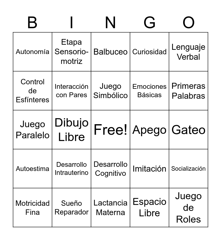 This bingo card has a free space and 25 words: Desarrollo Intrauterino, Lactancia Materna, Juego Simbólico, Motricidad Fina, Lenguaje Verbal, Autonomía, Control de Esfínteres, Etapa Sensorio-motriz, Apego, Desarrollo Cognitivo, Emociones Básicas, Juego Paralelo, Imitación, Socialización, Interacción con Pares, Etapa Preoperacional, Gateo, Balbuceo, Primeras Palabras, Dibujo Libre, Juego de Roles, Sueño Reparador, Autoestima, Curiosidad and Espacio Libre.
