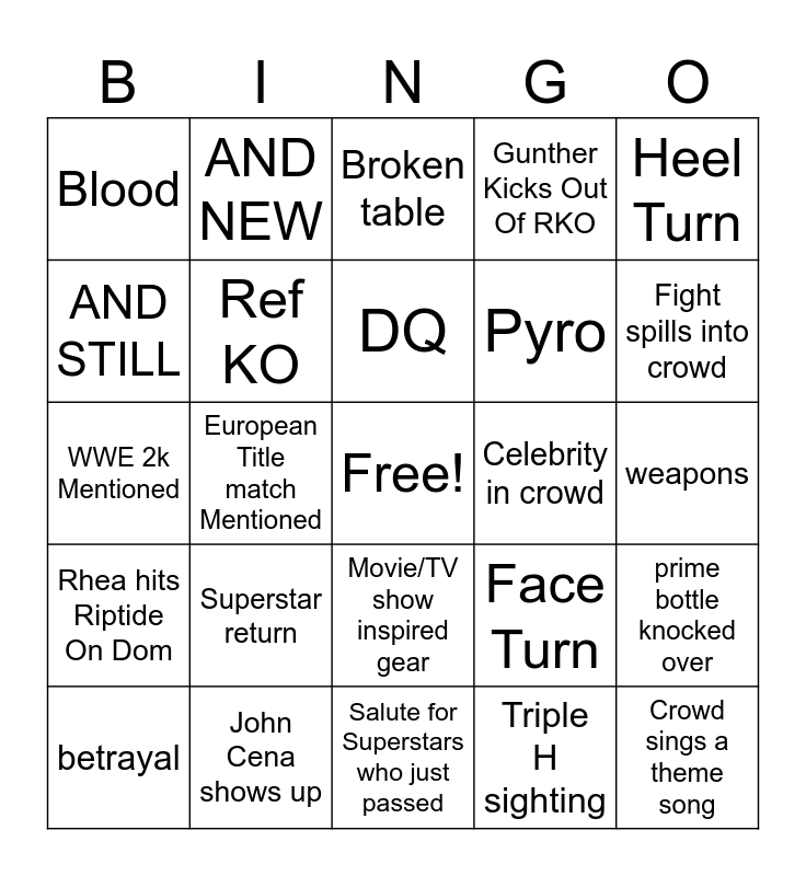 This bingo card has a free space and 24 words: Superstar return, John Cena shows up, DQ, betrayal, Heel Turn, Blood, AND STILL, AND NEW, Celebrity in crowd, Movie/TV show inspired gear, Pyro, WWE 2k Mentioned, Face Turn, prime bottle knocked over, Ref KO, Triple H sighting, weapons, Broken table, Fight spills into crowd, European Title match Mentioned, Crowd sings a theme song, Rhea hits Riptide On Dom, Gunther Kicks Out Of RKO and Salute for Superstars who just passed.