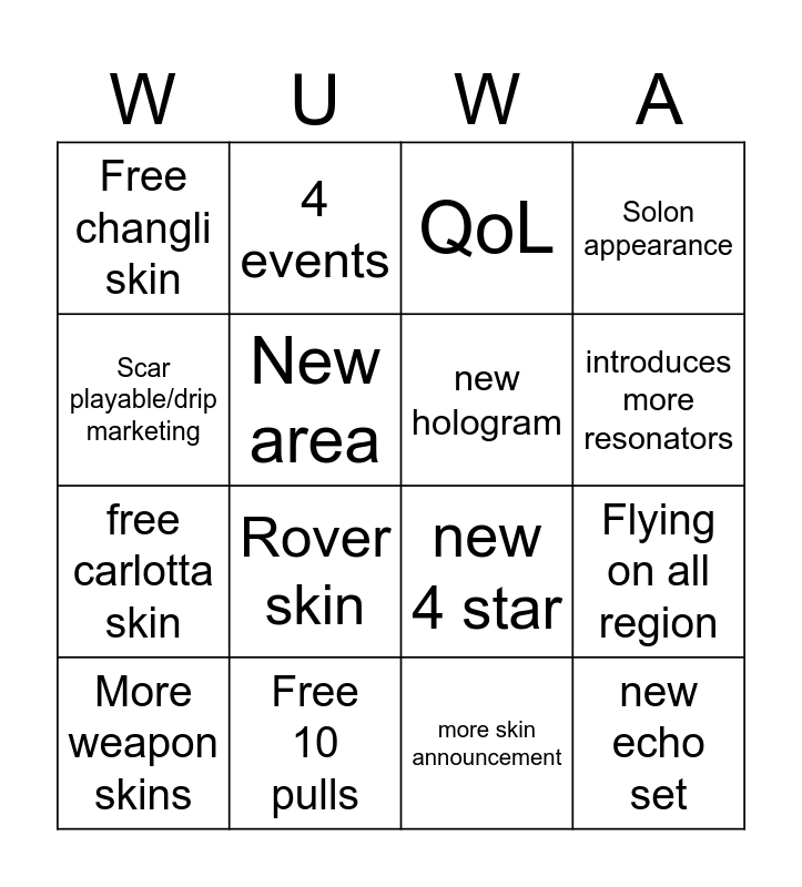 This bingo card has 16 words: Free 10 pulls, Flying on all region, QoL, Free changli skin, free carlotta skin, 4 events, new 4 star, more skin announcement, Scar playable/drip marketing, New area, More weapon skins, Solon appearance, Rover skin, introduces more resonators, new hologram and new echo set.