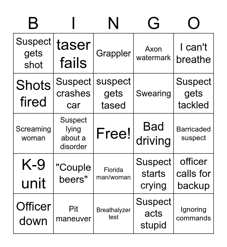 This bingo card has a free space and 24 words: "Couple beers", Pit maneuver, suspect gets tased, Officer down, I can't breathe, Suspect gets shot, Shots fired, taser fails, Bad driving, Florida man/woman, Swearing, Screaming woman, Suspect starts crying, officer calls for backup, Suspect crashes car, Suspect acts stupid, Barricaded suspect, Grappler, Suspect gets tackled, Suspect lying about a disorder, Ignoring commands, K-9 unit, Axon watermark and Breathalyzer test.