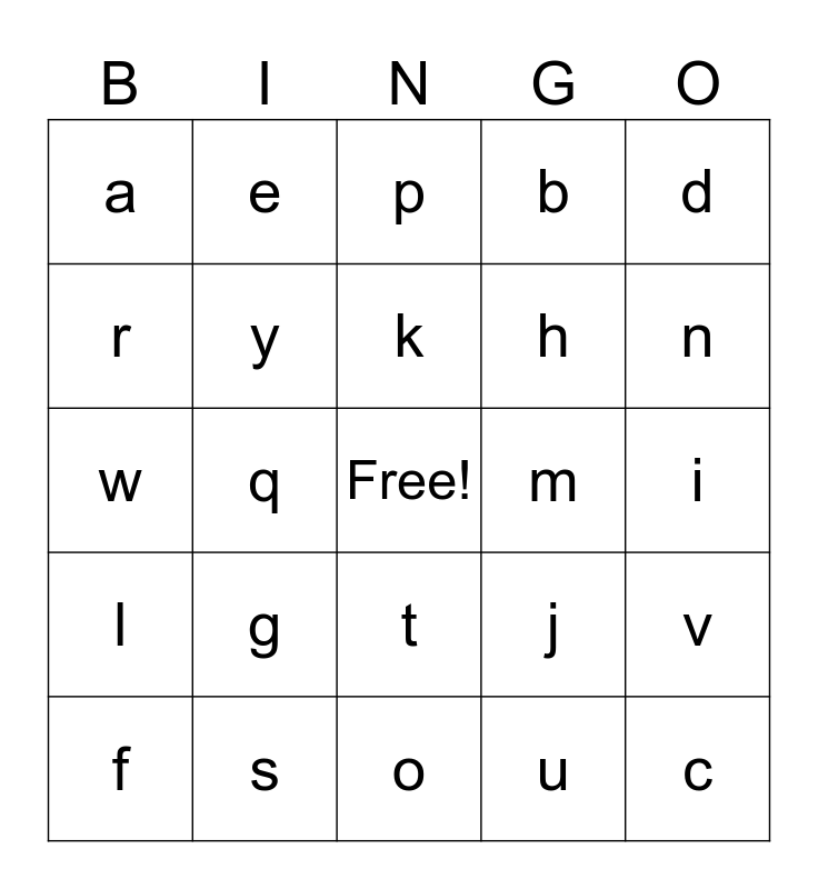 This bingo card has a free space and 26 words: t, u, k, s, d, a, r, e, i, j, h, w, v, f, q, x, b, l, p, c, n, o, m, g, y and z.