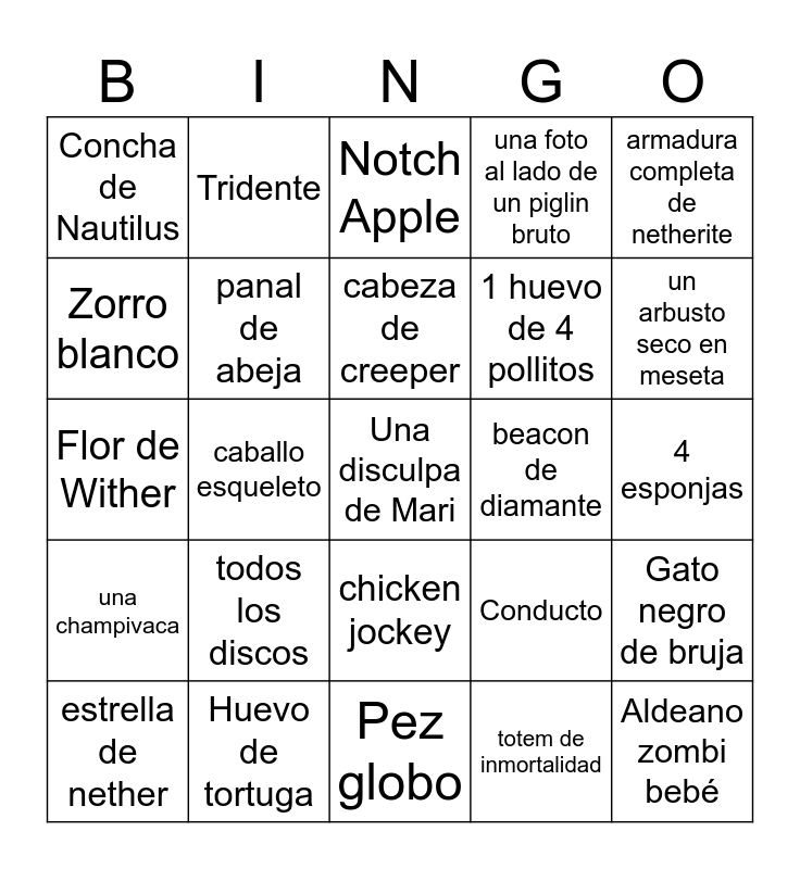 This bingo card has a free space and 24 words: estrella de nether, todos los discos, cabeza de creeper, totem de inmortalidad, armadura completa de netherite, Concha de Nautilus, Tridente, Notch Apple, beacon de diamante, 4 esponjas, Flor de Wither, panal de abeja, Conducto, Gato negro de bruja, Zorro blanco, Huevo de tortuga, Pez globo, una foto al lado de un piglin bruto, un arbusto seco en meseta, una champivaca, caballo esqueleto, chicken jockey, 1 huevo de 4 pollitos and Aldeano zombi bebé.