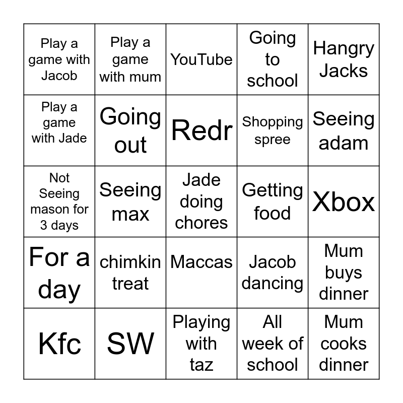 This bingo card has a free space and 24 words: chimkin treat, SW, Redr, Kfc, Hangry Jacks, Play a game with Jacob, Play a game with Jade, Play a game with mum, Getting food, Maccas, Shopping spree, Not Seeing mason for 3 days, Jacob dancing, Mum buys dinner, Going out, All week of school, Xbox, YouTube, Seeing adam, Seeing max, Mum cooks dinner, For a day, Going to school and Playing with taz.