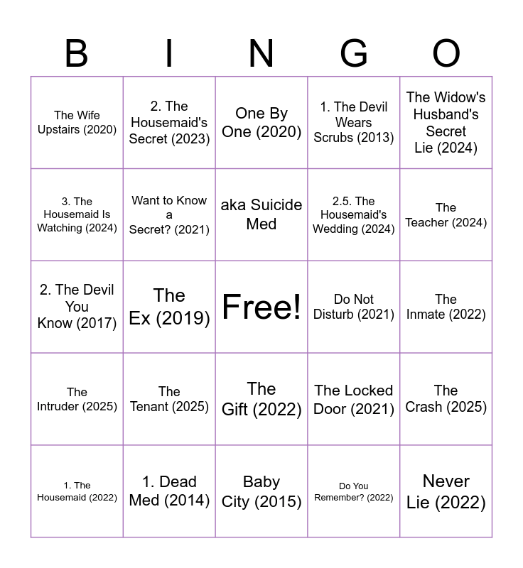 This bingo card has a free space and 31 words: Baby City (2015), The Surrogate Mother (2018), The Ex (2019), The Perfect Son (2019), The Wife Upstairs (2020), One By One (2020), Want to Know a Secret? (2021), The Locked Door (2021), Do Not Disturb (2021), Do You Remember? (2022), The Inmate (2022), Never Lie (2022), Ward D (2023), The Coworker (2023), The Teacher (2024), The Boyfriend (2024), The Crash (2025), The Tenant (2025), The Intruder (2025), The Gift (2022), The Widow's Husband's Secret Lie (2024), Death Row 2025, 1. The Housemaid (2022), 2. The Housemaid's Secret (2023), 2.5. The Housemaid's Wedding (2024), 3. The Housemaid Is Watching (2024), 1. The Devil Wears Scrubs (2013), 2. The Devil You Know (2017), 1. Dead Med (2014), aka Suicide Med and 2. Brain Damage (2016).