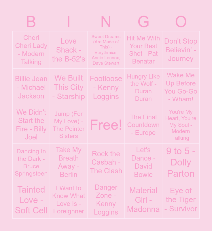 This bingo card has a free space and 75 words: Africa - TOTO, Faith - George Michael, Sweet Dreams (Are Made of This) - Eurythmics, Annie Lennox, Dave Stewart, Maneater - Daryl Hall & John Oates, Karma Chameleon - Culture Club, Beat It - Michael Jackson, You Make My Dreams (Come True) - Daryl Hall & John Oates, Your Love - The Outfield, You Spin Me Round - Dead or Alive, I Wanna Dance with Somebody (Who Loves Me) - Whitney Houston, I'm So Excited - The Pointer SIsters, It's Still Rock and Roll to Me - Billy Joel, Footloose - Kenny Loggins, Billie Jean - Michael Jackson, Push It - Salt-N-Pepa, Jump (For My Love) - The Pointer Sisters, Holding Out for a Hero - Bonnie Tyler, Eye of the Tiger - Survivor, All Night Long (All Night) - Lionel Richie, Don't Stop Believin' - Journey, Uptown Girl - Billy Joel, We Didn't Start the Fire - Billy Joel, We Built This City - Starship, Love Shack - the B-52's, Hit Me With Your Best Shot - Pat Benatar, Kiss - Price, Every Breath You Take - The Police, Who Can It Be Now? - Men at Work, (I've Had) The Time of My Life - From "Dirty Dancing" Soundtrack - Bill Medley, Jennifer Warnes, Don't You (Forget About Me) - Simple Minds, Down Under - Men At Work, I'm Gonna Be (500 Miles) - The Proclaimers, Keep on Loving You - REO Speedwagon, Let's Dance - David Bowie, Wake Me Up Before You Go-Go - Wham!, Hungry Like the Wolf - Duran Duran, Take on Me - a-ha, Girls Just Want to Have Fun - Cyndi Lauper, You're My Heart, You're My Soul - Modern Talking, Material Girl - Madonna, My Prerogative - Bobby Brown, Time After Time - Cyndi Lauper, Never Gonna Give You Up - Rick Astley, Walk Like an Egyptian - The Bangles, What I Like About You - The Romantics, Whip It - DEVO, Tainted Love - Soft Cell, Cheri Cheri Lady - Modern Talking, Jessie's Girl - Rick Springfield, Don't You Want Me - The Human League, Nothing's Gonna Stop Us Now - Starship, Rock the Casbah - The Clash, Should I Stay or Should I Go - The Clash, What A Feeling - Irene Cara, Just like Heaven - The Cure, 99 Red Balloons - Nena, Thriller - Michael Jackson, Straight Up - Paulla Abdul, Take Me Home Tonight - Eddie Money, You Got It - Roy Orbison, Take My Breath Away - Berlin, Tell It to My Heart - Taylor Dayne, The Power Of Love - Huey Lewis & The News, Total Eclipse of the Heart - Bonnie Tyler, Easy Lover - Philip Bailey, Phil Collins, The Final Countdown - Europe, Ghostbusters - Ray Parker Jr., Come On Eileen - Dexys Midnight Runners, Kevin Rowland, She Drives Me Crazy - Fine Young Cannibals, 9 to 5 - Dolly Parton, Dancing In the Dark - Bruce Springsteen, I Want to Know What Love Is - Foreighner, Sunglasses At Night - Corey Hart, Danger Zone - Kenny Loggins and Like a Virgin - Madonna.