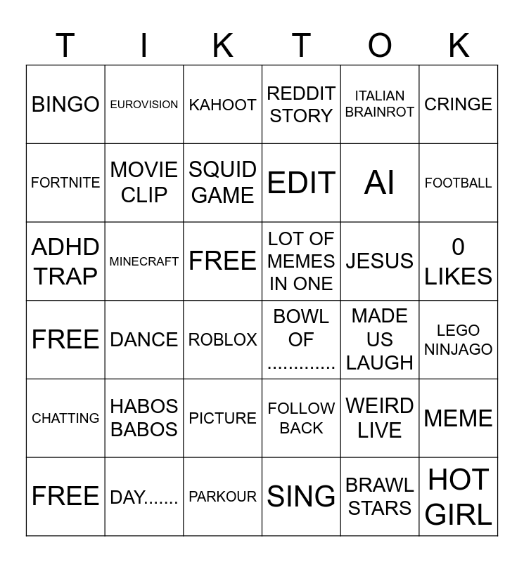This bingo card has 36 words: FOLLOW BACK, PICTURE, SING, FORTNITE, FREE, LOT OF MEMES IN ONE, MOVIE CLIP, PARKOUR, ITALIAN BRAINROT, WEIRD LIVE, FOOTBALL, REDDIT STORY, MEME, MINECRAFT, EDIT, BINGO, CHATTING, JESUS, ADHD TRAP, KAHOOT, FREE, DANCE, BOWL OF ............., ROBLOX, MADE US LAUGH, EUROVISION, AI, DAY......., SQUID GAME, CRINGE, HOT GIRL, FREE, LEGO NINJAGO, 0 LIKES, HABOS BABOS and BRAWL STARS.