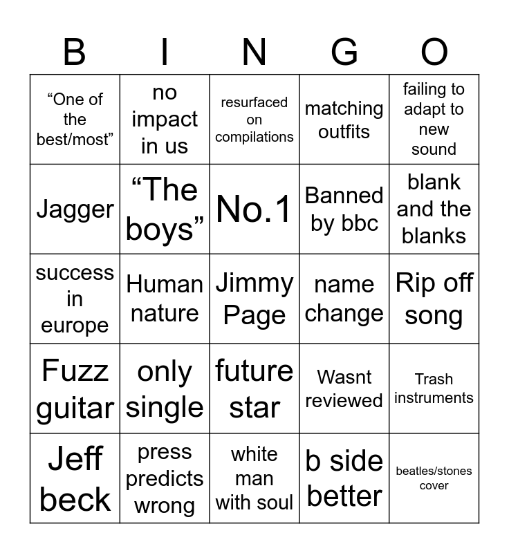 This bingo card has a free space and 43 words: Joe meek, beatles/stones cover, ray Davies, Jeff beck, insane haircut, b side better, resurfaced on compilations, proto-punk, failing to adapt to new sound, press predicts wrong, matching outfits, name change, future star, only single, Richie Blackmore, white man with soul, moved to europe, success in europe, popular in hometown, blank and the blanks, no impact in us, "excellent", eric clapton/cream, “One of the best/most”, Press needlessly mean, Rip off song, Made famous by cover, Collectors item, Wasnt reviewed, Fuzz guitar, Last single, Trash instruments, Sideburns, Human nature, Penny valentine likes, Penny valentine hates, Didn’t chart, No.1, Jagger, Banned by bbc, Club success, “The boys” and B side instrumental.