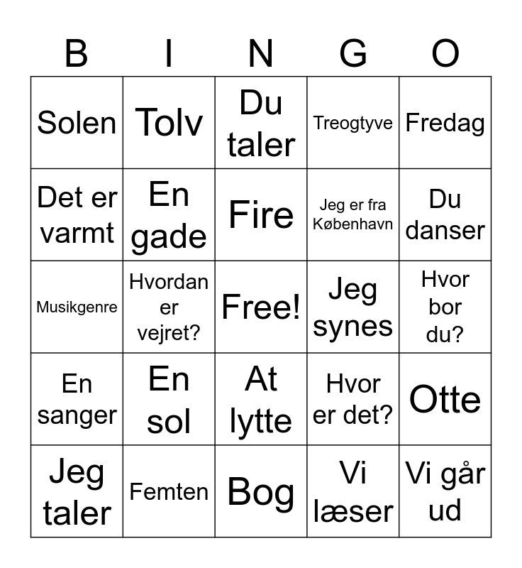 This bingo card has a free space and 29 words: Jeg taler, Vi spiser, Hvordan er vejret?, Det regner, Solen, Du taler, En gade, En sol, Jeg synes, Femten, Hvor bor du?, Vi går ud, Bog, Vi læser, Du danser, Elev, At lytte, En sanger, Fredag, Musikgenre, Hvor er det?, Han/hun er her ikke, Jeg er fra København, Det er varmt, Treogtyve, Tolv, Otte, Fire and Sytten.