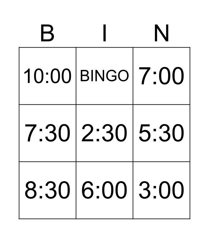 This bingo card has 12 words: 10:30, 3:00, 2:30, 5:30, BINGO, 7:00, 6:00, 4:30, 10:00, 7:30, 8:30 and 9:00.