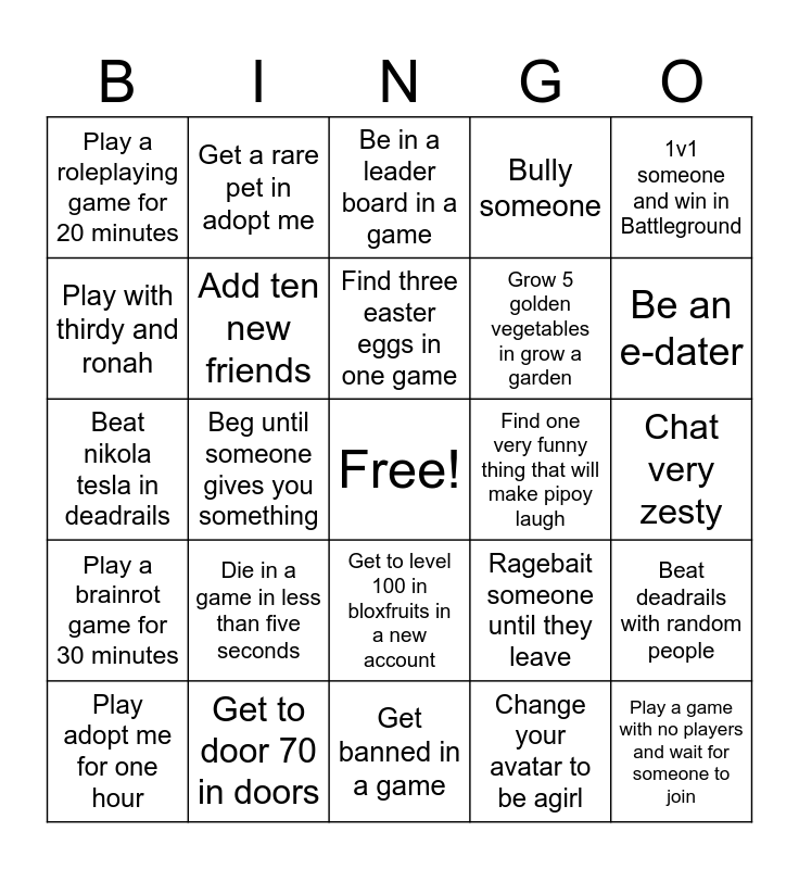 This bingo card has a free space and 24 words: Die in a game in less than five seconds, Get to door 70 in doors, Find three easter eggs in one game, Play adopt me for one hour, 1v1 someone and win in Battleground, Play a roleplaying game for 20 minutes, Play with thirdy and ronah, Get a rare pet in adopt me, Find one very funny thing that will make pipoy laugh, Get to level 100 in bloxfruits in a new account, Grow 5 golden vegetables in grow a garden, Beat nikola tesla in deadrails, Ragebait someone until they leave, Beat deadrails with random people, Add ten new friends, Change your avatar to be agirl, Chat very zesty, Be in a leader board in a game, Be an e-dater, Beg until someone gives you something, Play a game with no players and wait for someone to join, Play a brainrot game for 30 minutes, Bully someone and Get banned in a game.