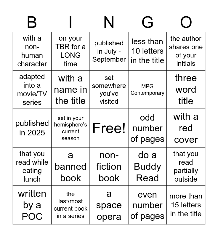 This bingo card has a free space and 24 words: a banned book, the last/most current book in a series, set somewhere you've visited, written by a POC, the author shares one of your initials, with a non-human character, adapted into a movie/TV series, on your TBR for a LONG time, odd number of pages, non-fiction book, MPG Contemporary, published in 2025, do a Buddy Read, that you read partially outside, with a name in the title, even number of pages, with a red cover, published in July - September, three word title, set in your hemisphere's current season, more than 15 letters in the title, that you read while eating lunch, less than 10 letters in the title and a space opera.