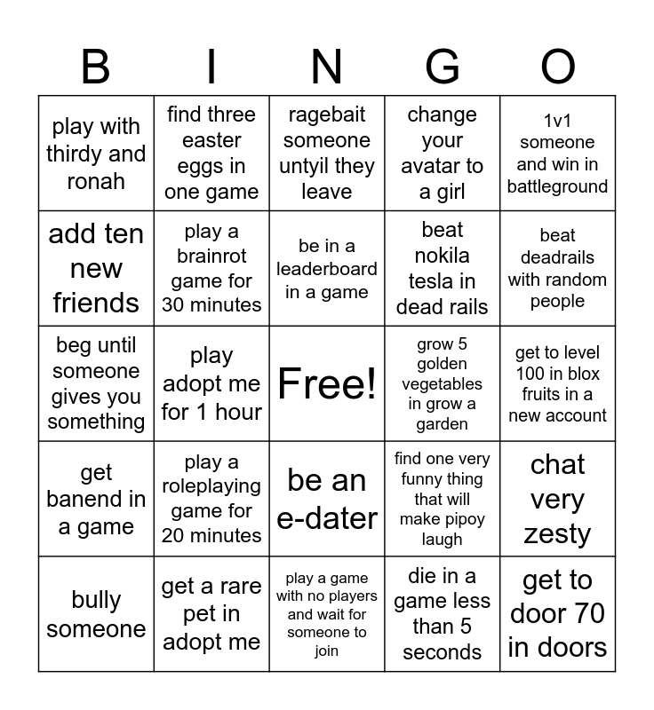 This bingo card has a free space and 24 words: play a roleplaying game for 20 minutes, get a rare pet in adopt me, be in a leaderboard in a game, bully someone, 1v1 someone and win in battleground, play with thirdy and ronah, add ten new friends, find three easter eggs in one game, grow 5 golden vegetables in grow a garden, be an e-dater, beat nokila tesla in dead rails, beg until someone gives you something, find one very funny thing that will make pipoy laugh, chat very zesty, play a brainrot game for 30 minutes, die in a game less than 5 seconds, get to level 100 in blox fruits in a new account, ragebait someone untyil they leave, beat deadrails with random people, play adopt me for 1 hour, get to door 70 in doors, get banend in a game, change your avatar to a girl and play a game with no players and wait for someone to join.