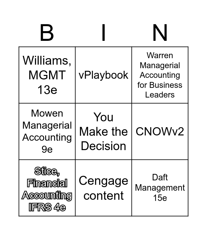 This bingo card has 9 words: Stice, Financial Accounting IFRS 4e, Warren Managerial Accounting for Business Leaders, vPlaybook, Mowen Managerial Accounting 9e, Williams, MGMT 13e, CNOWv2, You Make the Decision, Daft Management 15e and Cengage content.