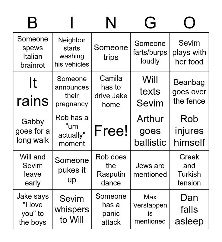 This bingo card has a free space and 24 words: Someone pukes it up, Sevim whispers to Will, Camila has to drive Jake home, Jake says "I love you" to the boys, Sevim plays with her food, Someone spews Italian brainrot, It rains, Neighbor starts washing his vehicles, Arthur goes ballistic, Rob does the Rasputin dance, Will texts Sevim, Gabby goes for a long walk, Jews are mentioned, Greek and Turkish tension, Someone announces their pregnancy, Max Verstappen is mentioned, Rob injures himself, Someone trips, Beanbag goes over the fence, Rob has a "um actually" moment, Dan falls asleep, Will and Sevim leave early, Someone farts/burps loudly and Someone has a panic attack.