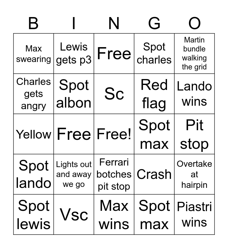 This bingo card has a free space and 24 words: Lights out and away we go, Vsc, Sc, Spot lewis, Martin bundle walking the grid, Max swearing, Charles gets angry, Lewis gets p3, Spot max, Ferrari botches pit stop, Red flag, Yellow, Crash, Overtake at hairpin, Spot albon, Spot max, Pit stop, Free, Lando wins, Free, Piastri wins, Spot lando, Spot charles and Max wins.