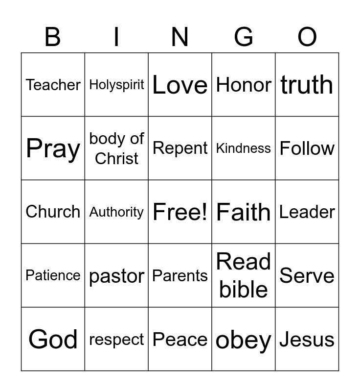 This bingo card has a free space and 24 words: pastor, respect, Repent, God, truth, Teacher, Pray, Holyspirit, Faith, Parents, Kindness, Church, Read bible, Serve, body of Christ, obey, Leader, Love, Follow, Authority, Jesus, Patience, Honor and Peace.