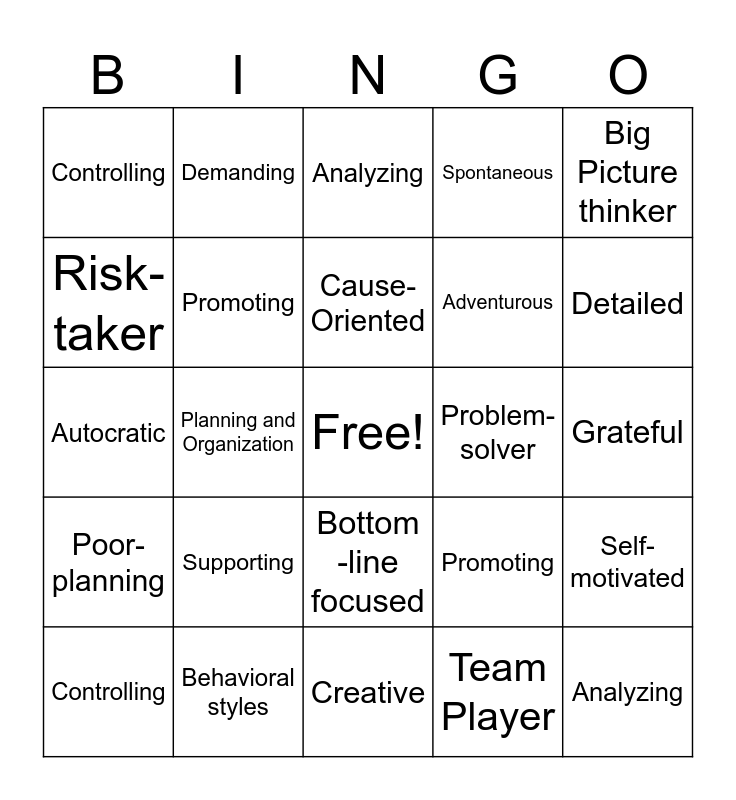 This bingo card has a free space and 29 words: Controlling, Strong- willed, Planning and Organization, Promoting, Controlling, Analyzing, Promoting, Supporting, Problem-solver, Behavioral styles, Grateful, Analyzing, Creative, Team Player, Detailed, Poor at follow up, Bottom -line focused, Poor-planning, Big Picture thinker, Autocratic, Promoting, Cooperative, Adventurous, Risk-taker, Spontaneous, Demanding, Self-motivated, Cause-Oriented and Flexible.