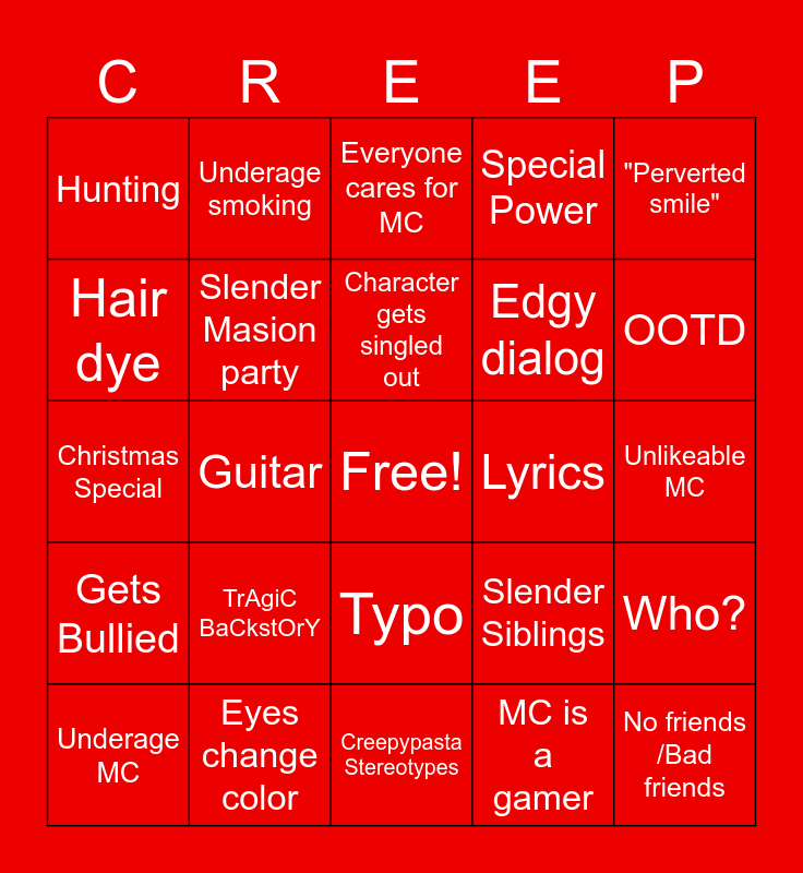 This bingo card has a free space and 54 words: Mary sue, Gets Bullied, Abusive parents, Child of Slenderman/ Zango, Typo, Love triangle, Special Power, Unlikable MC, Hair dye, Psychotic laugh, Hunting, Slender Mansion, Eyes change color, Underage MC, YUCK, Creepypasta Stereotypes, No friends /Bad friends, Edgy dialog, MC is always the victim, Unlikeable MC, Slender Siblings, MC has a Knife, Lyrics, "Perverted smile", Underage drinking, Underage smoking, Impossible anatomy, Anime mention, Not like the other girls, MC is a gamer, Not how trauma works, Teens In the Woods, Not how police works, MC scares creepypastas, Everyone cares for MC, UrGe tO kILL!, Christmas Special, Who?, Author's OC/s, Slender Masion party, Too many details, Too few details, Car crash, MC's parents die, TrAgiC BaCkstOrY, IDC!!, Just talk, He has a point, Character gets singled out, Guitar, OOTD, Routine, Speshul Talent and Self Harm.