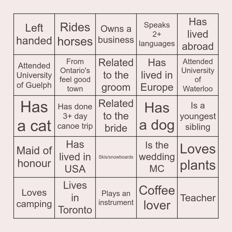 This bingo card has 25 words: Maid of honour, Lives in Toronto, Related to the bride, Coffee lover, Has lived abroad, Left handed, Rides horses, Owns a business, Has a dog, Loves plants, Attended University of Guelph, From Ontario's feel good town, Plays an instrument, Is the wedding MC, Attended University of Waterloo, Loves camping, Has done 3+ day canoe trip, Related to the groom, Has lived in Europe, Is a youngest sibling, Has a cat, Has lived in USA, Skis/snowboards, Speaks 2+ languages and Teacher.