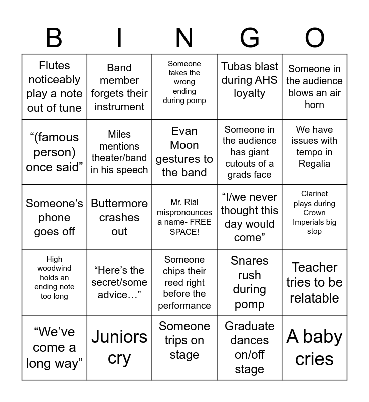 This bingo card has a free space and 24 words: “Here’s the secret/some advice…”, Juniors cry, Evan Moon gestures to the band, “We’ve come a long way”, Someone in the audience blows an air horn, Flutes noticeably play a note out of tune, “(famous person) once said”, Band member forgets their instrument, “I/we never thought this day would come”, Someone chips their reed right before the performance, Someone in the audience has giant cutouts of a grads face, Someone’s phone goes off, Snares rush during pomp, Teacher tries to be relatable, Miles mentions theater/band in his speech, Graduate dances on/off stage, Clarinet plays during Crown Imperials big stop, Someone takes the wrong ending during pomp, We have issues with tempo in Regalia, Buttermore crashes out, A baby cries, High woodwind holds an ending note too long, Tubas blast during AHS loyalty and Someone trips on stage.